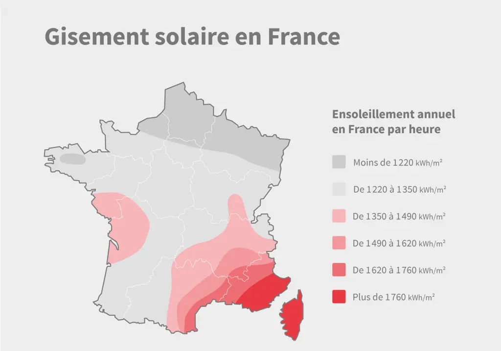 L’infographie ci-dessous vous donne un aperçu du gisement solaire en France par région.